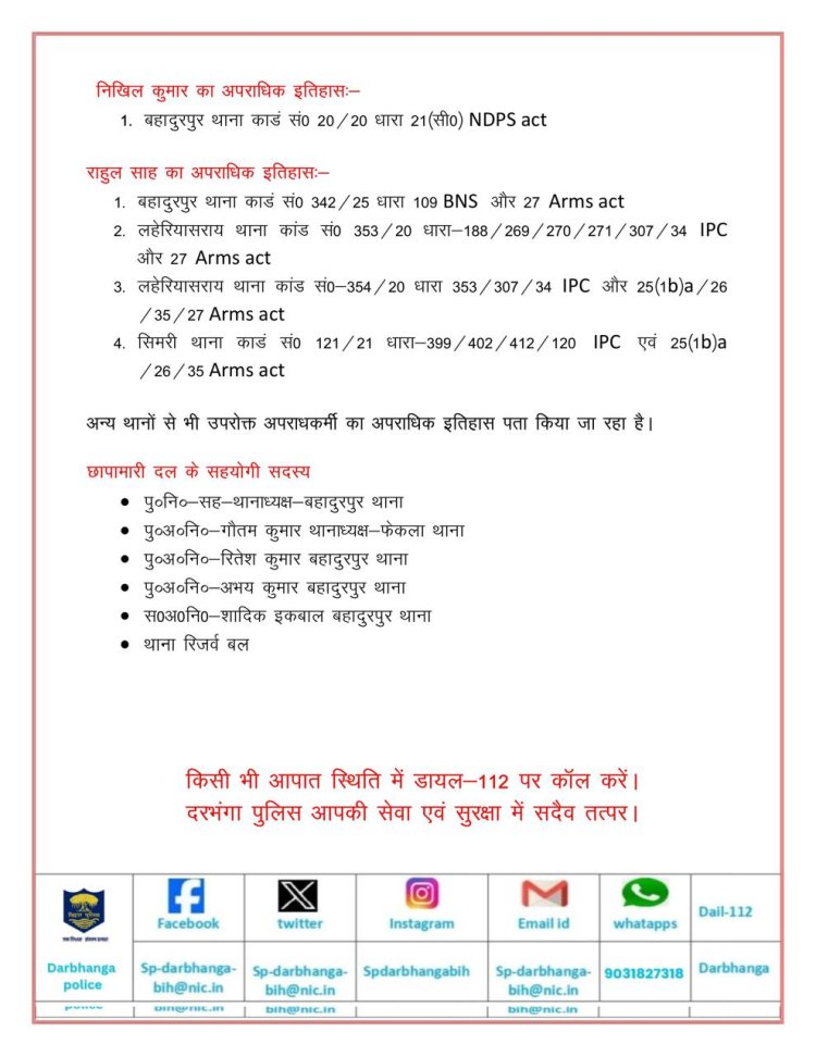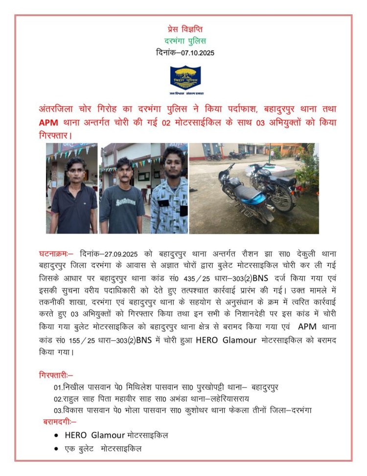 सन्नाटा टूटता है छापेमारी और गिरफ्तारियां: दरभंगा पुलिस की तकनीकी शाखा, बहादुरपुर थाना और APM थाना के संयुक्त प्रयासों ने छापेमारी के क्रम में तीन आरोपियों को गिरफ्तार किया। इन तीनों की तस्वीरें और अपराधियों की सूची प्रेस विज्ञप्ति में संलग्न कर दी गई है ताकि नागरिकों को स्पष्ट संदेश मिले कि अपराधी अब सुरक्षित नहीं हैं। गिरफ्तार आरोपियों के नाम (प्रेस विज्ञप्ति अनुसार) निखिल पासवान, राहुल साह और विकास पासवान वे सिर्फ़ नाम नहीं, बल्कि इलाके में फैले हुए अपराध के प्रतीक बन चुके थे। गिरफ्तारी के समय जिन दृश्यों ने रिपोर्टरों को हिला दिया, वे थे आरोपियों की चुप्पी, उनके आँखों में निहित उदासीनतापूर्ण कठोरता, और एक ऐसा अंदाज़ मानो वे हर बार पकड़े जाने का हिसाब जोड़ते रहे हों। पुलिस ने उनके कब्जे से एक HERO Glamour और एक बुलेट मोटरसाइकिल बरामद करने का खुलासा किया। बरामदगी ने साबित कर दिया कि यह गिरोह सिर्फ़ एक-टाइम चोर नहीं, व्यवस्थित चैन का हिस्सा है।