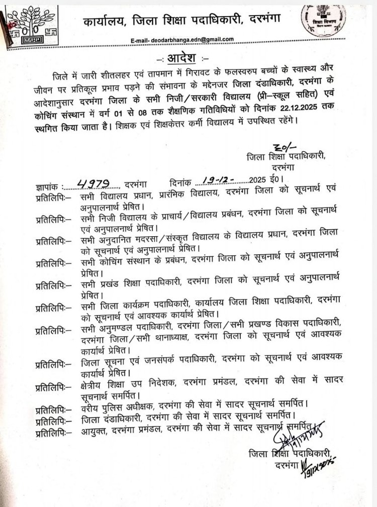 आगे भी मौसम पर नजर: प्रशासन ने स्पष्ट किया है कि मौसम की स्थिति पर लगातार नजर रखी जा रही है। यदि ठंड का प्रकोप इसी तरह जारी रहता है, तो आगे भी आवश्यकतानुसार निर्णय लिए जाएंगे। फिलहाल 22 दिसंबर तक बच्चों को ठंड से राहत मिलेगी, वहीं शिक्षक विद्यालय में उपस्थित रहकर शैक्षणिक और प्रशासनिक कार्यों को संभालेंगे। कुल मिलाकर, दरभंगा में कड़ाके की ठंड के बीच जिला प्रशासन का यह फैसला बच्चों के हित में लिया गया एक जिम्मेदार और संवेदनशील कदम माना जा रहा है, जिसने न सिर्फ अभिभावकों की चिंता कम की है, बल्कि प्रशासन के प्रति भरोसे को भी और मजबूत किया है।